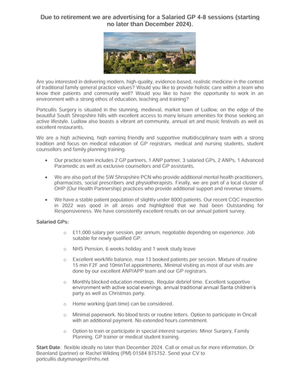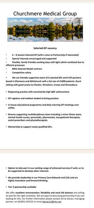 Much Wenlock and Cressage Medical Practice, a semi-rural practice based in Shropshire, are looking to recruit an enthusiastic, caring and highly motivated salaried GP to join our team. Â